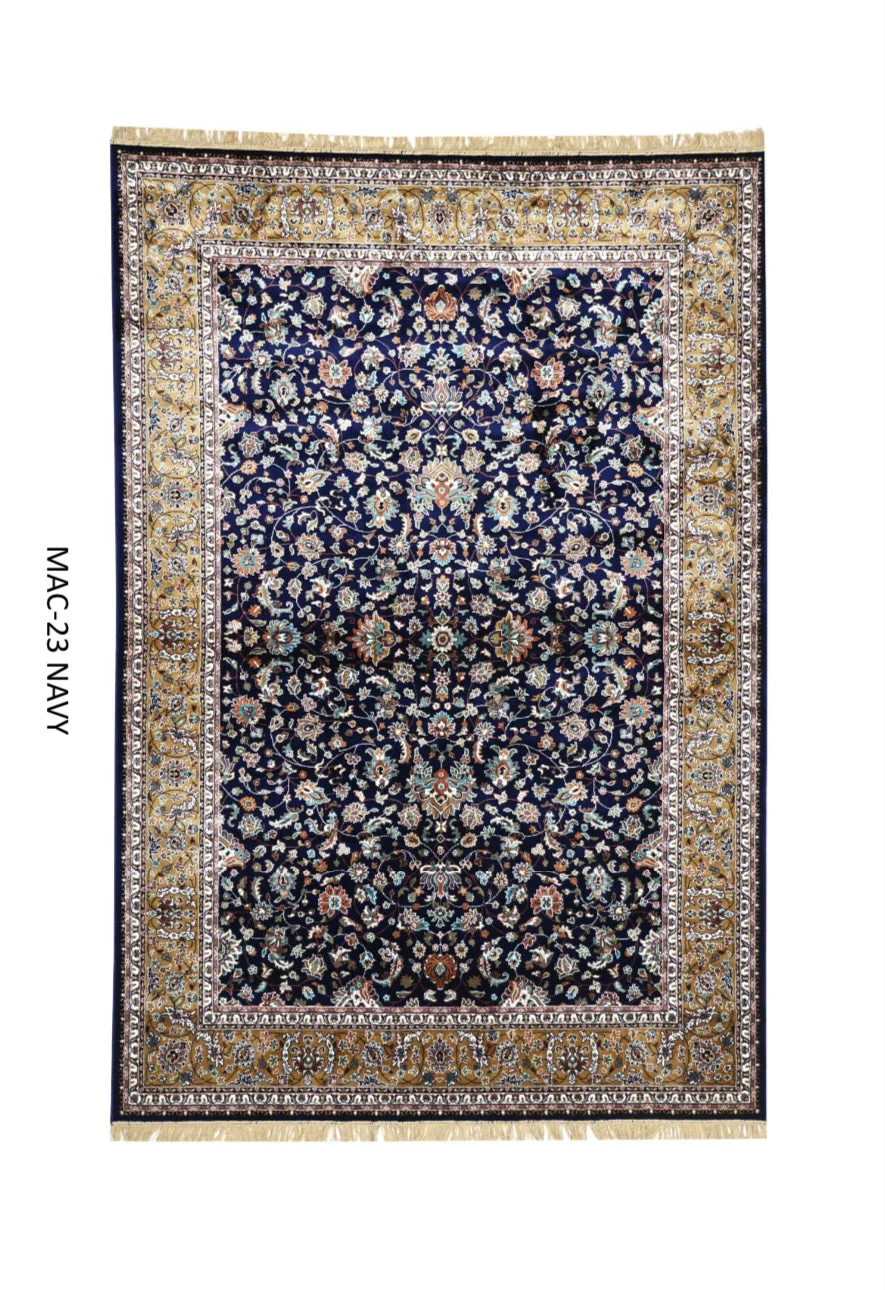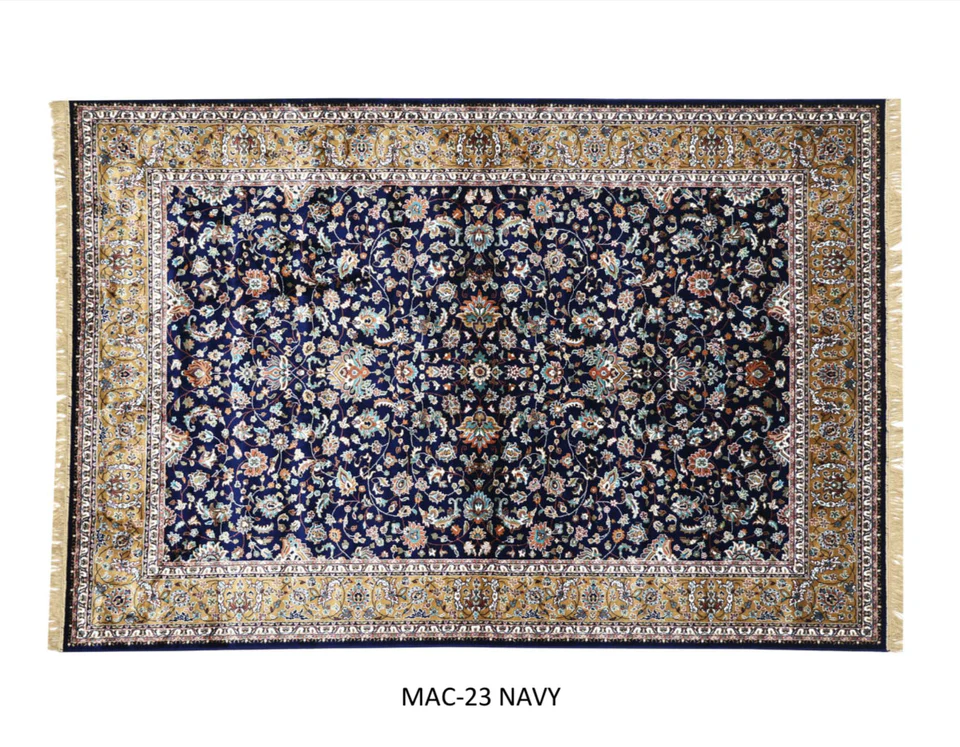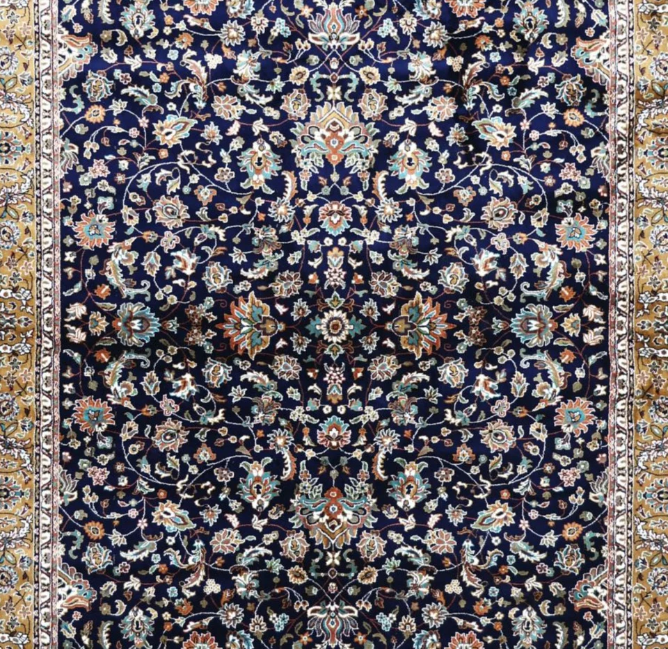 The Premium Navy Blue & Gold Persian-Style Silk Carpet reflects classic Persian artistry enhanced with a rich, luxurious color combination. Designed for elegant living rooms and bedrooms, the deep navy blue base is complemented by refined gold accents, creating a sophisticated and timeless statement for premium interiors.